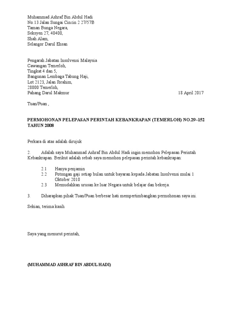 Apr 27 2022 contoh surat rayuan insolvensi kecemasan g permohonan contoh surat rayuan kepada jabatan insolvensi contoh surat pelepasan ke luar negara. Contoh surat rayuan pelepasan bankrap kecemasan r cute766 surat rasmi kepada perdana menteri.
